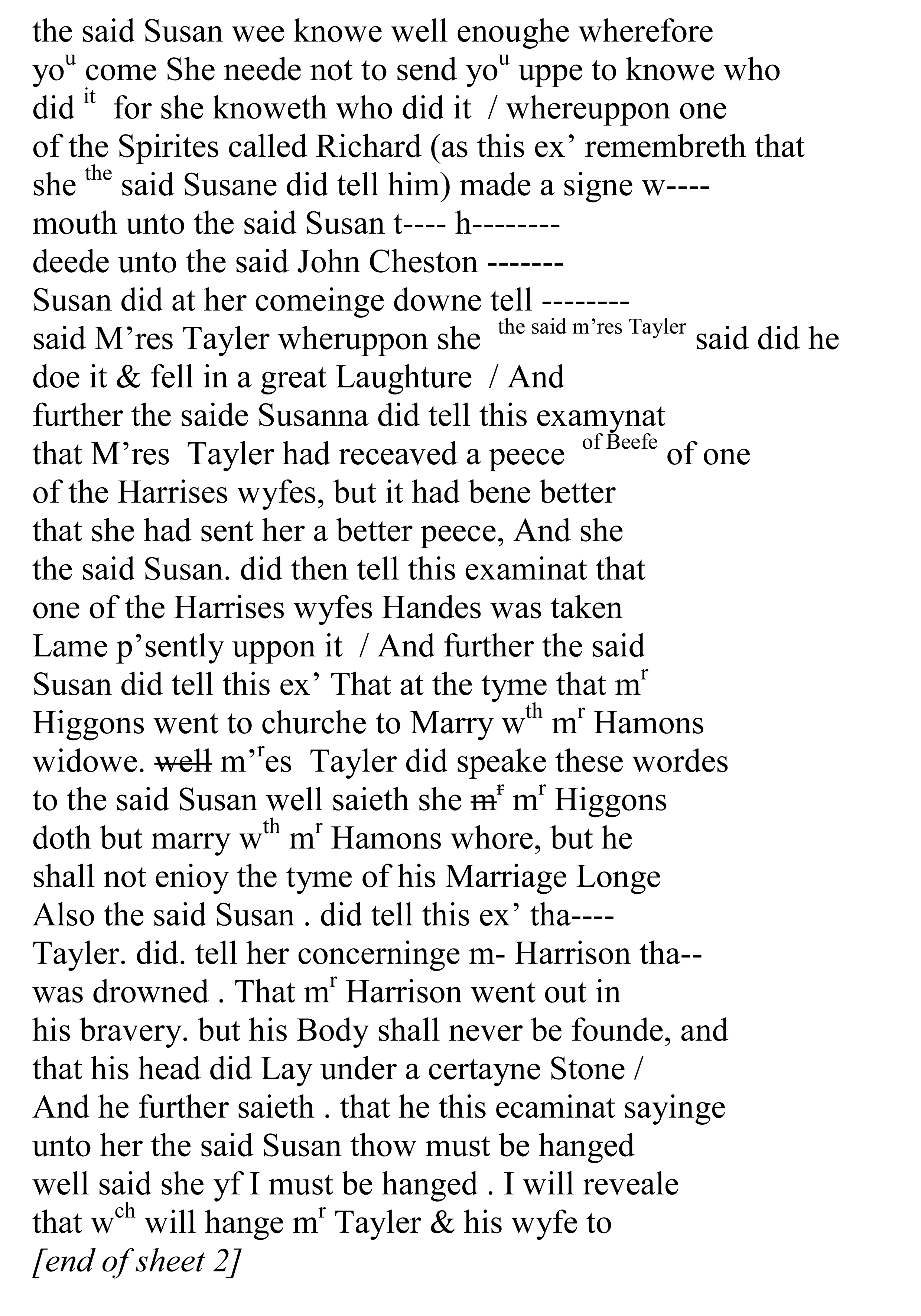 “We know well enough wherefore you come, she need not to send you up to know who did it, for she knoweth who did it.” Whereupon one of the spirits called Richard (as this examinate remembreth that she the said Susan did tell him) made a sign w--- mouth unto the said Susan, t--- h------ deed unto the said John Cheston ------- Susan did at her coming down tell ------ said Mistress Taylor, whereupon she the said Mistress Taylor said