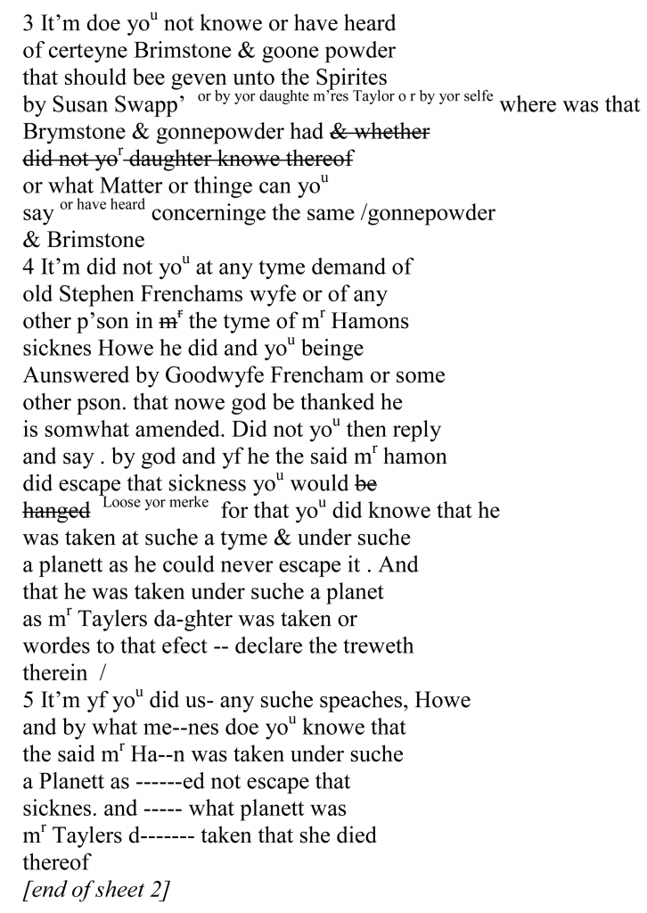 5 Item. If you did us[e] any such speeches, how and by what means do you know that the said Master Ha[mo]n was taken under such a planet as [he coul]d not escape that sickness, and [under] what planet was Master Taylor’s d[aughter] taken, that she died thereof?