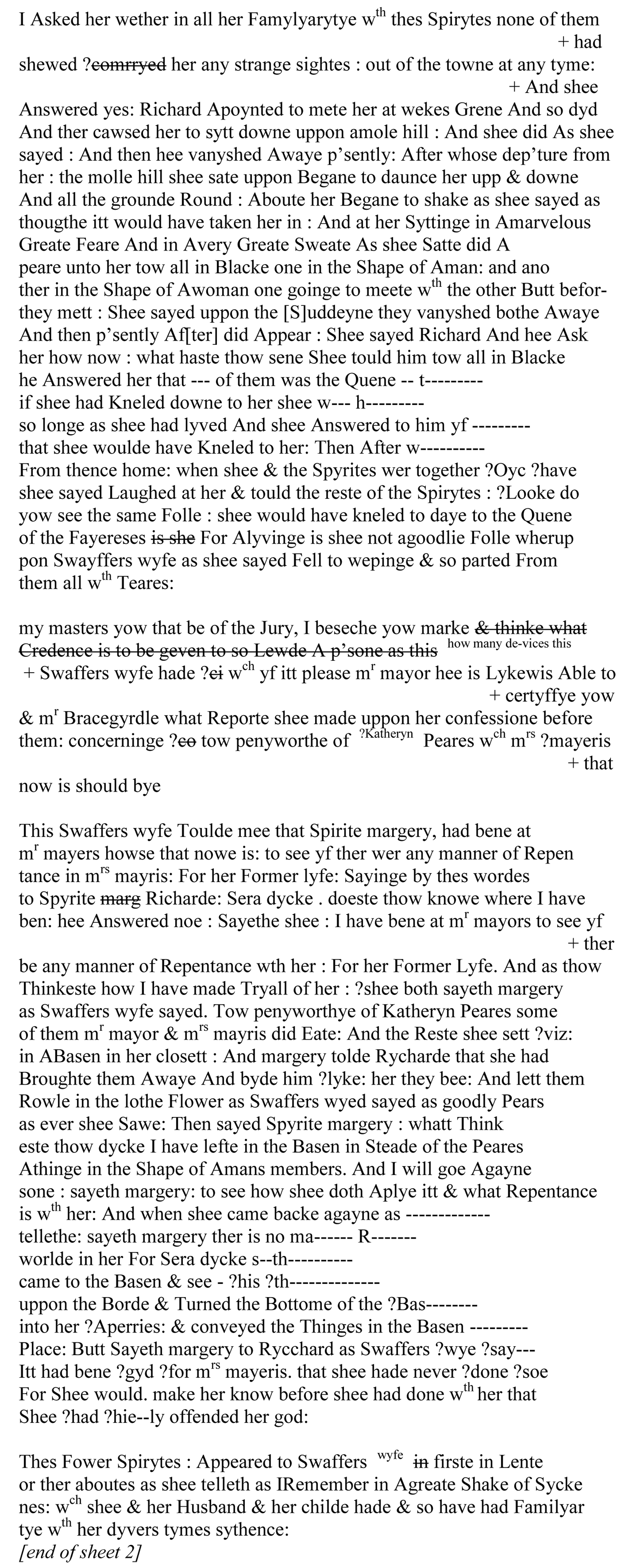 And when she came back again as ------ telleth, sayeth Margery, there is no ma---- r---- world in her, for, Sirrah Dick, s—th------ came to the basin and see - ?his ?th------ upon the board, and turned the bottom of the ?bas------ into her ?aperries and conveyed the things in the basin ------ place. But sayeth Margery to Richard, as Swaffer’s [wife sayeth], it had been good for Mistress Mayoress that she had never ?done ?so. For she would make her know, before she had done with her, that she had [highly] offended her God.