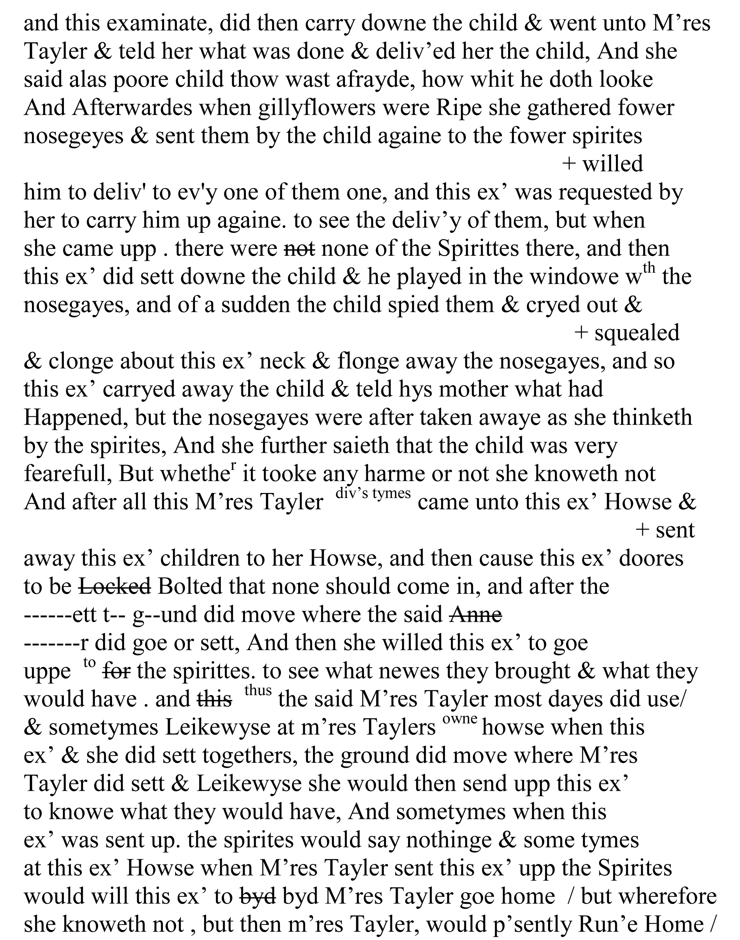 And after all this Mistress Taylor divers times came unto this examinate’s house, and sent away this examinate’s children to her house, and then cause this examinate’s doors to be locked bolted, that none should come in. And after the -----ett t[he] g[ro]und did move where the said Anne -----r did go or set. And then she willed this examinate to go up to for the spirits, to see what news they brought, and what they would have. And this thus the said Mistress Taylor most days did use.